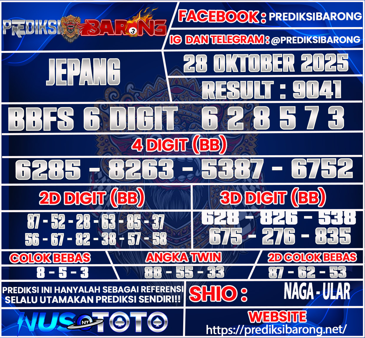 Prediksi Barong adalah layanan prediksi togel yang dirancang khusus untuk membantu para pemain togel dalam meraih keberuntungan. Pada edisi kali ini, kami menyajikan prediksi togel untuk pasar Jepang pada hari Minggu 19  Oktober 2025 Dengan analisis mendalam dan metode yang telah teruji, kami berusaha memberikan angka-angka yang memiliki potensi tinggi untuk keluar. Prediksi ini tidak hanya berdasarkan keberuntungan semata, tetapi juga menggunakan data statistik dan pola permainan sebelumnya yang dapat memberikan wawasan lebih bagi para pemain.