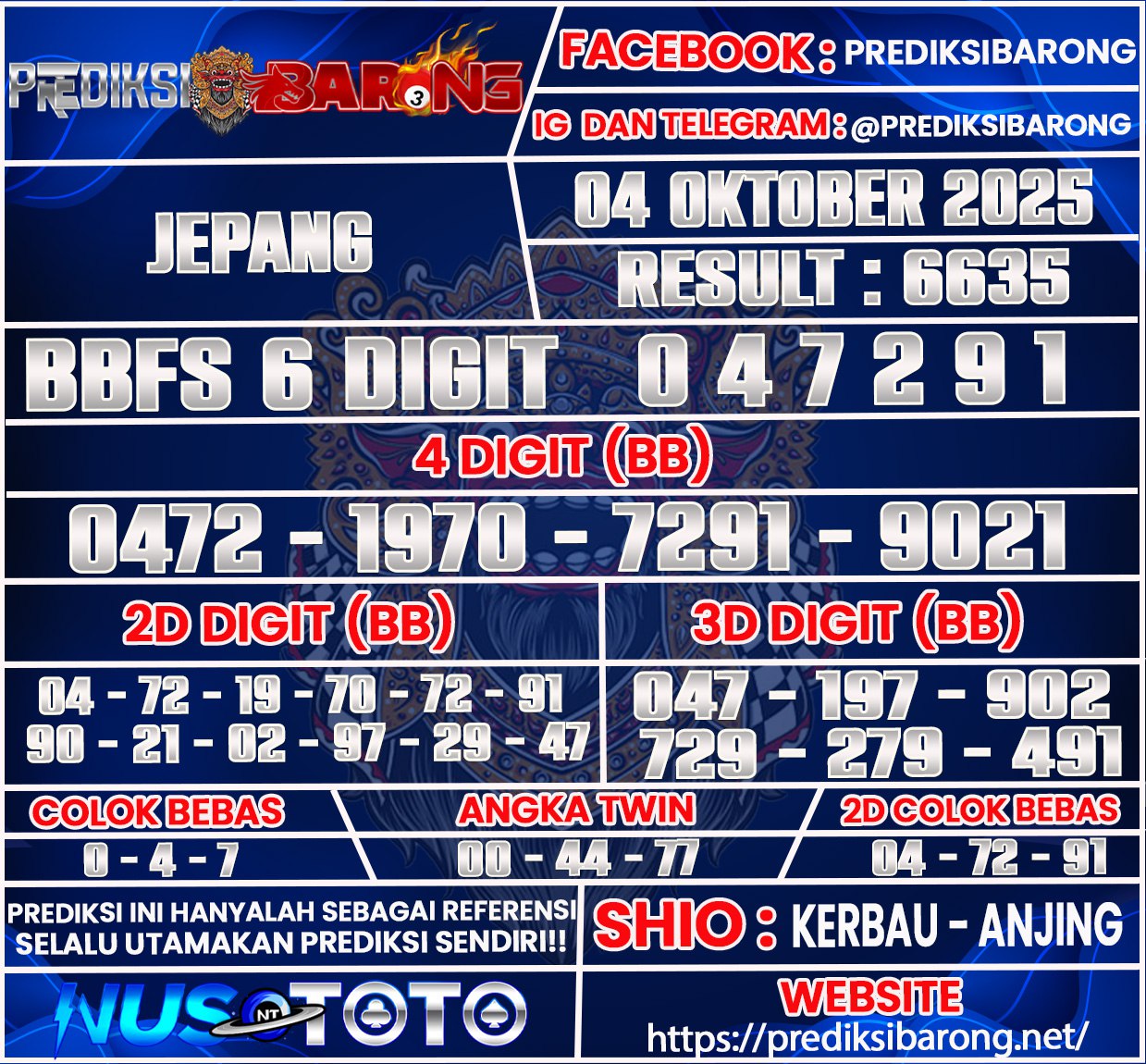 Selamat datang di Situs Prediksi Barong. Prediksi Barong merupakan situs prediksi angka togel yang berasal dari situs togel terpercaya dan teramanah yaitu NUSTOTO. Prediksi Barong sendiri sudah berdiri dari tahun 2019 hingga sekarang dan kualitasnya sudah di uji oleh para ahli paito dan pecinta togel resmi. Hari ini Prediksi Barong telah menyediakan Prediksi Jepang Sabtu 04 Oktober 2025 untuk anda semuanya.