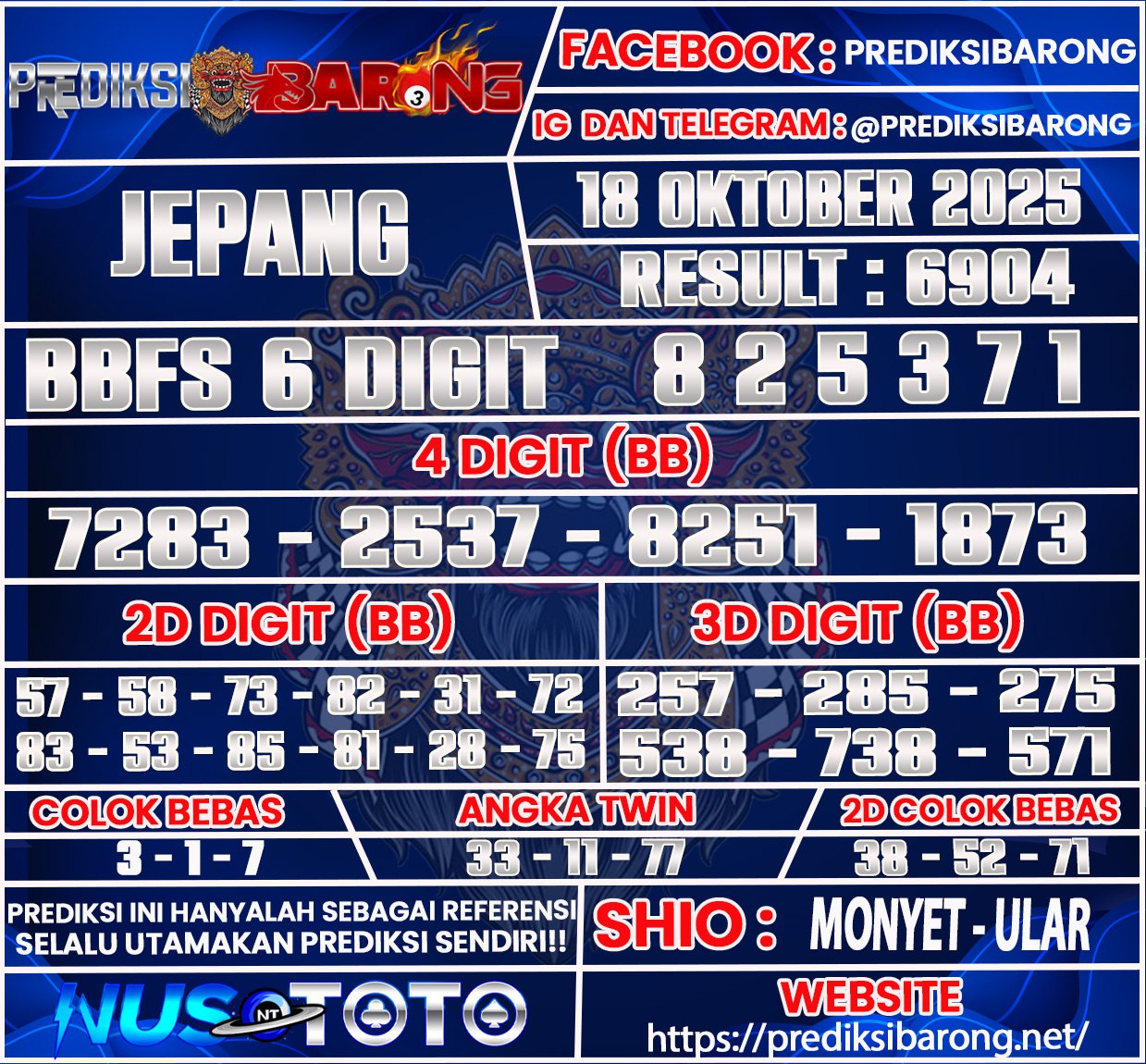 Prediksi Barong adalah layanan prediksi togel yang dirancang khusus untuk membantu para pemain togel dalam meraih keberuntungan. Pada edisi kali ini, kami menyajikan prediksi togel untuk pasar Jepang pada hari Sabtu 18 Oktober 2025 Dengan analisis mendalam dan metode yang telah teruji, kami berusaha memberikan angka-angka yang memiliki potensi tinggi untuk keluar. Prediksi ini tidak hanya berdasarkan keberuntungan semata, tetapi juga menggunakan data statistik dan pola permainan sebelumnya yang dapat memberikan wawasan lebih bagi para pemain.