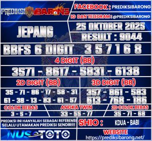 Prediksi Barong adalah layanan prediksi togel yang dirancang khusus untuk membantu para pemain togel dalam meraih keberuntungan. Pada edisi kali ini, kami menyajikan prediksi togel untuk pasar Jepang pada hari Minggu 19 Oktober 2025 Dengan analisis mendalam dan metode yang telah teruji, kami berusaha memberikan angka-angka yang memiliki potensi tinggi untuk keluar. Prediksi ini tidak hanya berdasarkan keberuntungan semata, tetapi juga menggunakan data statistik dan pola permainan sebelumnya yang dapat memberikan wawasan lebih bagi para pemain.