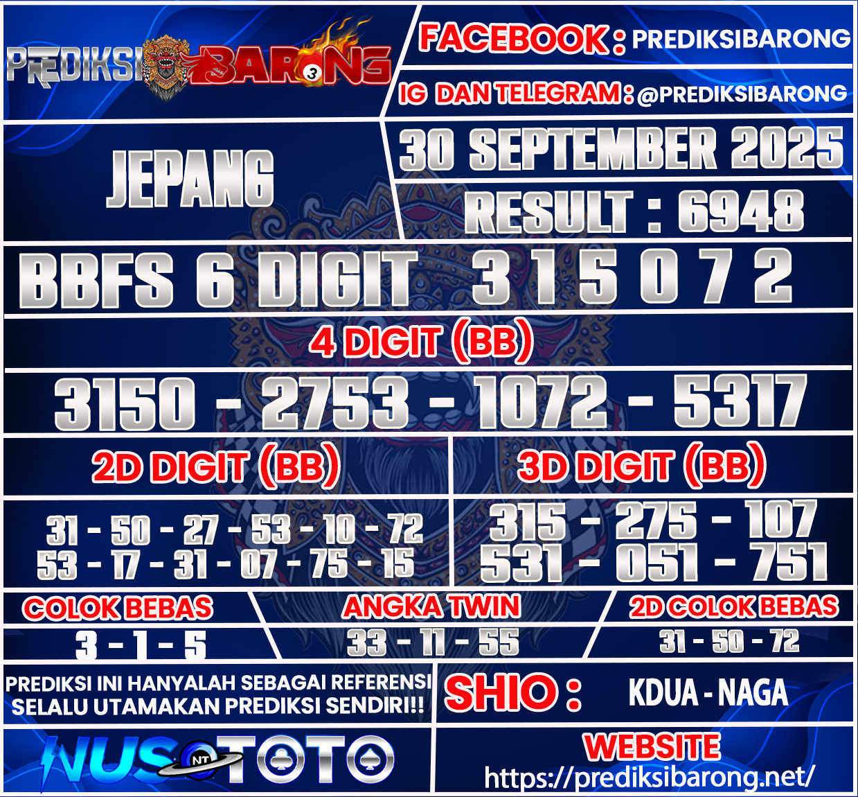 Selamat datang di Situs Prediksi Barong. Prediksi Barong merupakan situs prediksi angka togel yang berasal dari situs togel terpercaya dan teramanah yaitu NUSTOTO. Prediksi Barong sendiri sudah berdiri dari tahun 2019 hingga sekarang dan kualitasnya sudah di uji oleh para ahli paito dan pecinta togel resmi. Hari ini Prediksi Barong telah menyediakan Prediksi Jepang Selasa 30 September Agustus 2025 untuk anda semuanya.