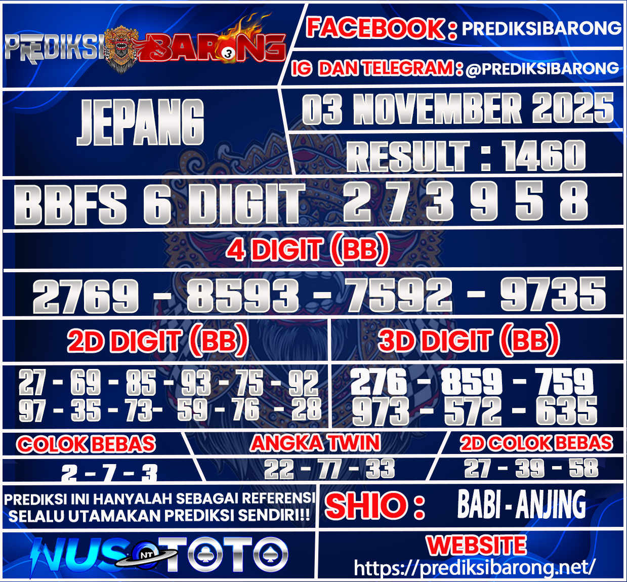 Selamat datang di Situs Prediksi Barong. Prediksi Barong merupakan situs prediksi angka togel yang berasal dari situs togel terpercaya dan teramanah yaitu NUSTOTO. Prediksi Barong sendiri sudah berdiri dari tahun 2019 hingga sekarang dan kualitasnya sudah di uji oleh para ahli paito dan pecinta togel resmi. Hari ini Prediksi Barong telah menyediakan Prediksi Jepang  Selasa 21 Oktober 2025 untuk anda semuanya.