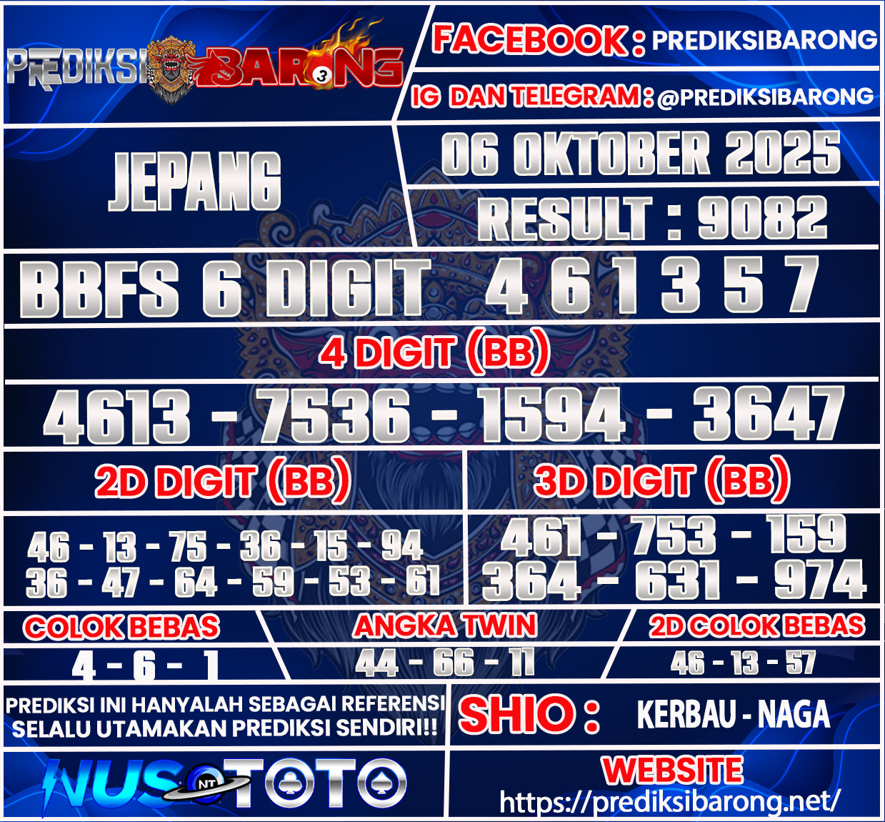 Prediksi Barong adalah layanan prediksi togel yang dirancang khusus untuk membantu para pemain togel dalam meraih keberuntungan. Pada edisi kali ini, kami menyajikan prediksi togel untuk pasar Jepang pada hari Minggu 05 Oktober 2025 Dengan analisis mendalam dan metode yang telah teruji, kami berusaha memberikan angka-angka yang memiliki potensi tinggi untuk keluar. Prediksi ini tidak hanya berdasarkan keberuntungan semata, tetapi juga menggunakan data statistik dan pola permainan sebelumnya yang dapat memberikan wawasan lebih bagi para pemain.