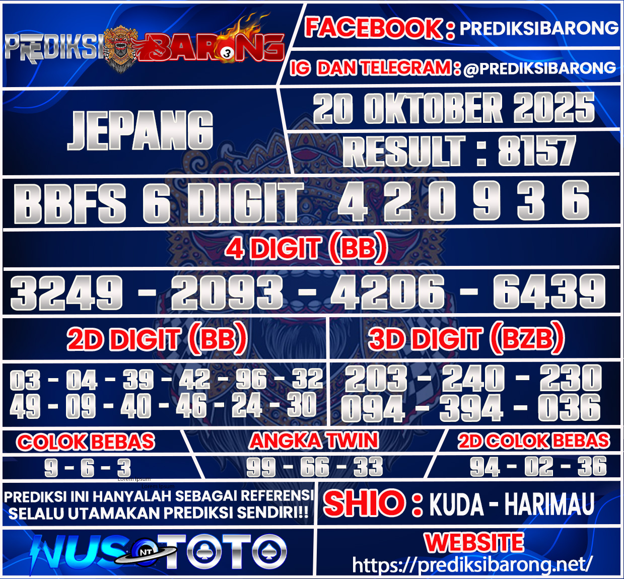 Selamat datang di Situs Prediksi Barong. Prediksi Barong merupakan situs prediksi angka togel yang berasal dari situs togel terpercaya dan teramanah yaitu NUSTOTO. Prediksi Barong sendiri sudah berdiri dari tahun 2019 hingga sekarang dan kualitasnya sudah di uji oleh para ahli paito dan pecinta togel resmi. Hari ini Prediksi Barong telah menyediakan Prediksi Jepang Senin 20 Oktober 2025 untuk anda semuanya.