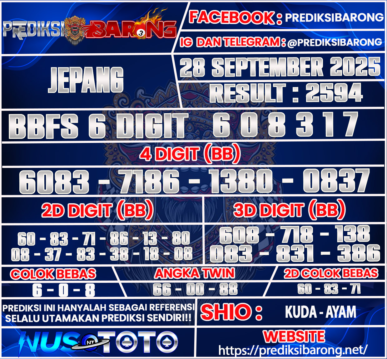 Selamat datang di Situs Prediksi Barong. Prediksi Barong merupakan situs prediksi angka togel yang berasal dari situs togel terpercaya dan teramanah yaitu NUSTOTO. Prediksi Barong sendiri sudah berdiri dari tahun 2019 hingga sekarang dan kualitasnya sudah di uji oleh para ahli paito dan pecinta togel resmi. Hari ini Prediksi Barong telah menyediakan Prediksi Jepang Senin 29 September Agustus 2025 untuk anda semuanya.