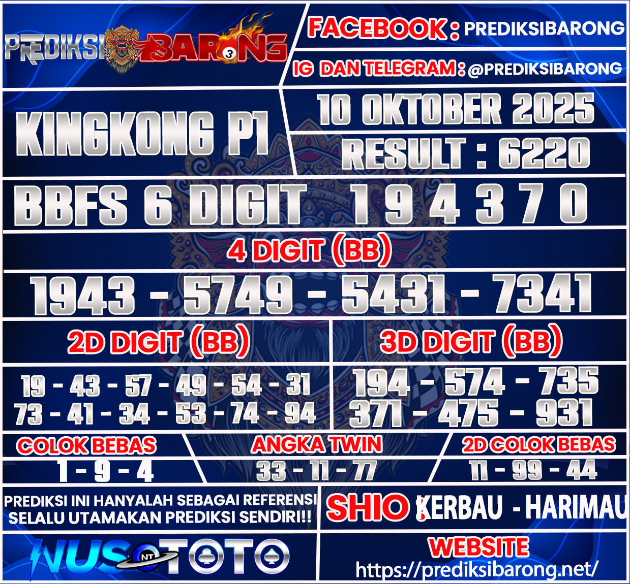 Prediksi Barong adalah layanan prediksi togel yang dirancang khusus untuk membantu para pemain togel dalam meraih keberuntungan. Pada edisi kali ini, kami menyajikan prediksi togel untuk pasar king kong P1 pada hari Jumat 10 Oktober 2025. Dengan analisis mendalam dan metode yang telah teruji, kami berusaha memberikan angka-angka yang memiliki potensi tinggi untuk keluar. Prediksi ini tidak hanya berdasarkan keberuntungan semata, tetapi juga menggunakan data statistik dan pola permainan sebelumnya yang dapat memberikan wawasan lebih bagi para pemain.