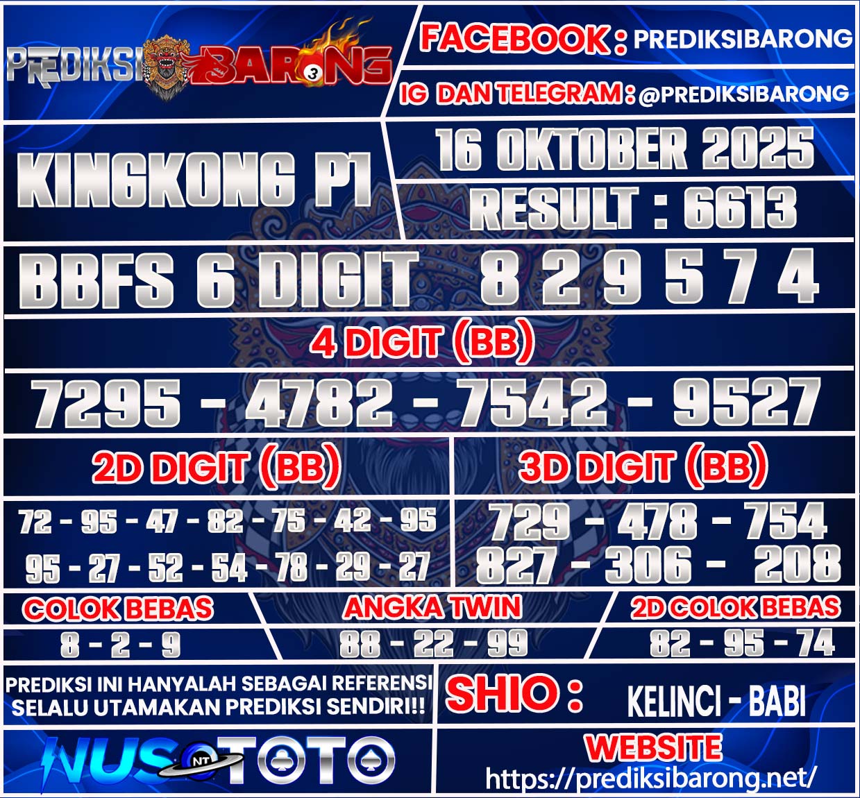 Oleh karena itu tanpa menunggu lama inilah Prediksi KINGKONG P1 Kamis Tanggal 16 Oktober 2025 Dari Prediksi Barong :