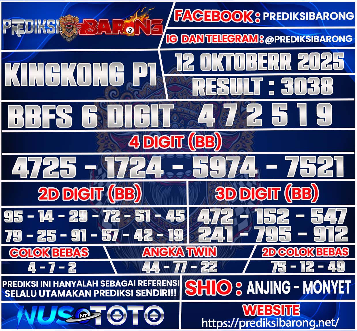 Selamat datang di Situs Prediksi Barong. Prediksi Barong merupakan situs prediksi angka togel yang berasal dari situs togel terpercaya dan teramanah yaitu NUSTOTO. Prediksi Barong sendiri sudah berdiri dari tahun 2019 hingga sekarang dan kualitasnya sudah di uji oleh para ahli paito dan pecinta togel resmi. Hari ini Prediksi Barong telah menyediakan Prediksi kingkong P1 Minggu 12  Oktober 2025 untuk anda semuanya.