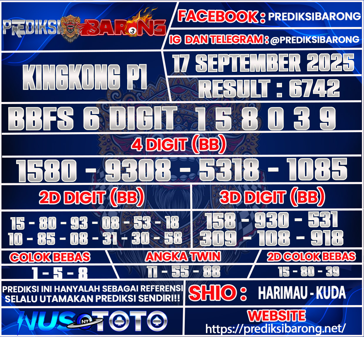 Selamat datang di Situs Prediksi Barong. Prediksi Barong merupakan situs prediksi angka togel yang berasal dari situs togel terpercaya dan teramanah yaitu NUSTOTO. Prediksi Barong sendiri sudah berdiri dari tahun 2018 hingga sekarang dan kualitasnya sudah di uji oleh para ahli paito dan pecinta togel resmi. Hari ini Prediksi Barong telah menyediakan Prediksi kingkong P1 Rabu 17 September 2025 untuk anda semuanya.
