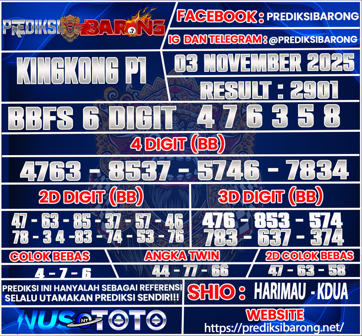 Prediksi Barong » Prediksi Togel KINGKONG P1Senin 03 November2025