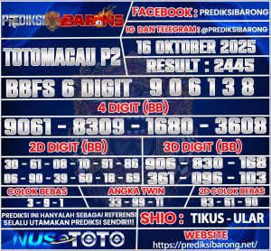 Prediksi Barong adalah layanan prediksi togel yang dirancang khusus untuk membantu para pemain togel dalam meraih keberuntungan. Pada edisi kali ini, kami menyajikan prediksi togel untuk pasar pada hari Rabu 15 Oktober 2025. Dengan analisis mendalam dan metode yang telah teruji, kami berusaha memberikan angka-angka yang memiliki potensi tinggi untuk keluar. Prediksi ini tidak hanya berdasarkan keberuntungan semata, tetapi juga menggunakan data statistik dan pola permainan sebelumnya yang dapat memberikan wawasan lebih bagi para pemain.