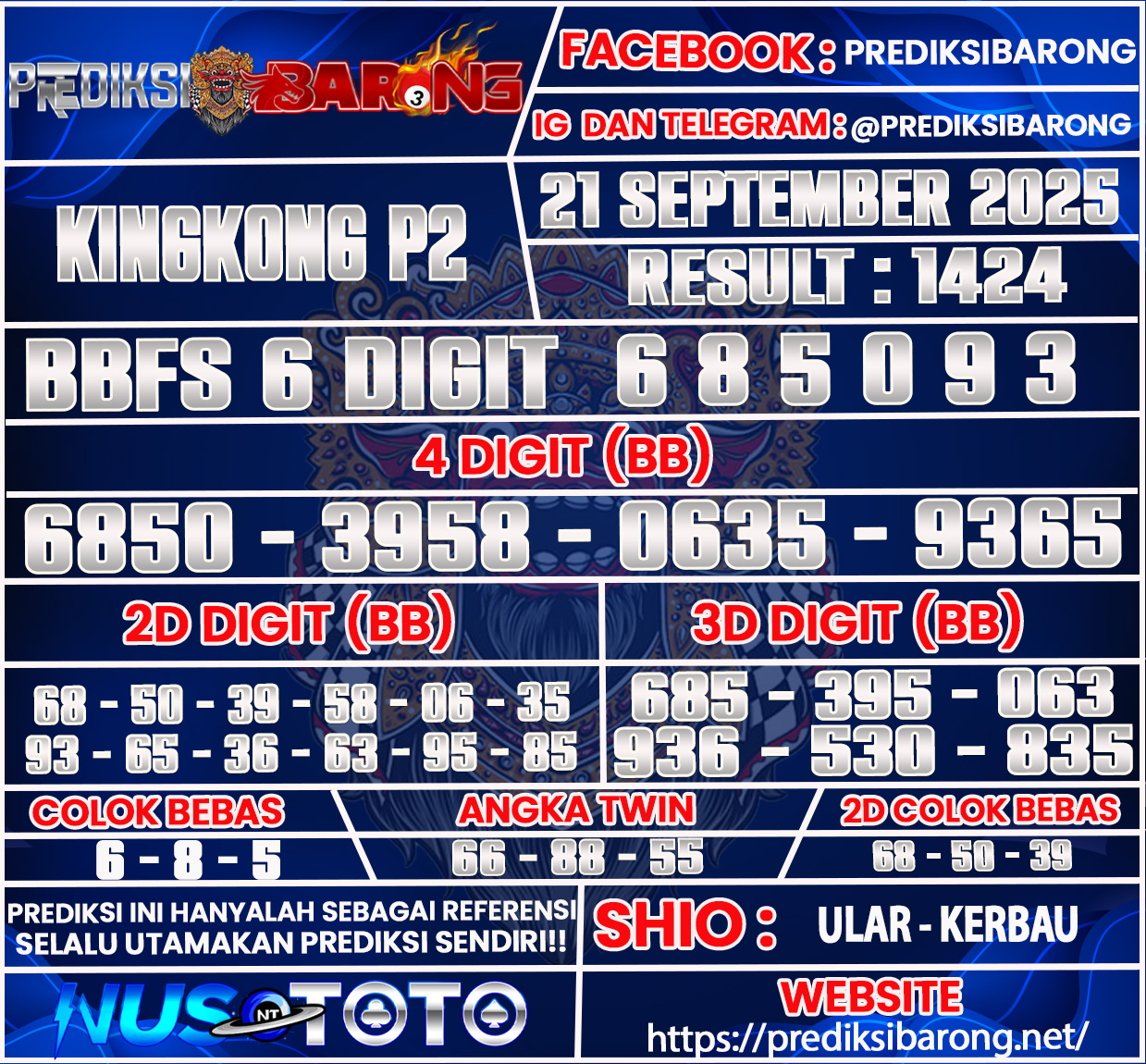 Oleh karena itu tanpa menunggu lama inilah Prediksi KINGKONG Minggu Tanggal 21 September 2025 Dari Prediksi Barong :.