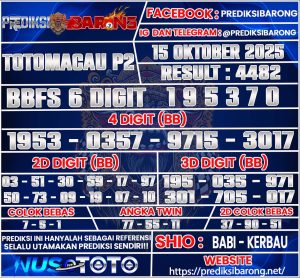 Prediksi Barong adalah layanan prediksi togel yang dirancang khusus untuk membantu para pemain togel dalam meraih keberuntungan. Pada edisi kali ini, kami menyajikan prediksi togel untuk pasar  pada hari Rabu 15 Oktober 2025. Dengan analisis mendalam dan metode yang telah teruji, kami berusaha memberikan angka-angka yang memiliki potensi tinggi untuk keluar. Prediksi ini tidak hanya berdasarkan keberuntungan semata, tetapi juga menggunakan data statistik dan pola permainan sebelumnya yang dapat memberikan wawasan lebih bagi para pemain.