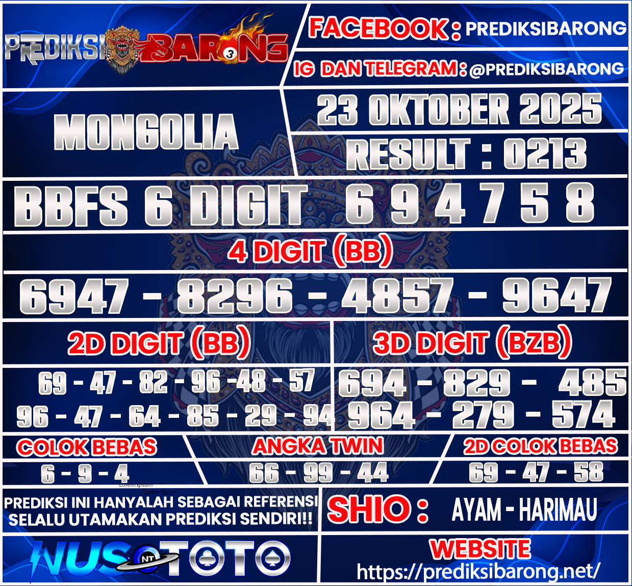 Selamat datang di Situs Prediksi Barong. Prediksi Barong merupakan situs prediksi angka togel yang berasal dari situs togel terpercaya dan teramanah yaitu NUSTOTO. Prediksi Barong sendiri sudah berdiri dari tahun 2018 hingga sekarang dan kualitasnya sudah di uji oleh para ahli paito dan pecinta togel resmi. Hari ini Prediksi Barong telah menyediakan Prediksi Mongolia Selasa 21 Oktober 2025 untuk anda semuanya.