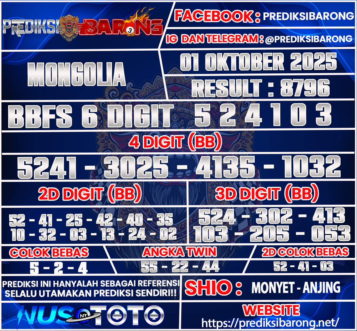Prediksi Barong adalah layanan prediksi togel yang dirancang khusus untuk membantu para pemain togel dalam meraih keberuntungan. Pada edisi kali ini, kami menyajikan prediksi togel untuk pasar Mongolia pada hari Rabu 01 Oktober 2025. Dengan analisis mendalam dan metode yang telah teruji, kami berusaha memberikan angka-angka yang memiliki potensi tinggi untuk keluar. Prediksi ini tidak hanya berdasarkan keberuntungan semata, tetapi juga menggunakan data statistik dan pola permainan sebelumnya yang dapat memberikan wawasan lebih bagi para pemain.