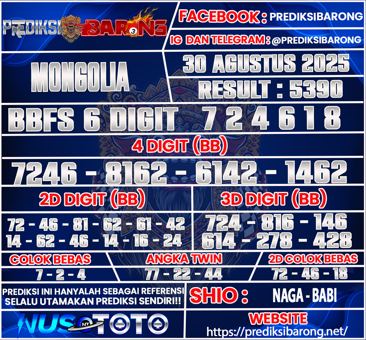 Prediksi Barong adalah layanan prediksi togel yang dirancang khusus untuk membantu para pemain togel dalam meraih keberuntungan. Pada edisi kali ini, kami menyajikan prediksi togel untuk pasar Mongolia pada hari Sabtu 30 Agustus 2025. Dengan analisis mendalam dan metode yang telah teruji, kami berusaha memberikan angka-angka yang memiliki potensi tinggi untuk keluar. Prediksi ini tidak hanya berdasarkan keberuntungan semata, tetapi juga menggunakan data statistik dan pola permainan sebelumnya yang dapat memberikan wawasan lebih bagi para pemain.