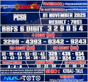 Prediksi Barong adalah layanan prediksi togel yang dirancang khusus untuk membantu para pemain togel dalam meraih keberuntungan. Pada edisi kali ini, kami menyajikan prediksi togel untuk pasar PCSO pada hari Sabtu 18 Oktober 2025. Dengan analisis mendalam dan metode yang telah teruji, kami berusaha memberikan angka-angka yang memiliki potensi tinggi untuk keluar. Prediksi ini tidak hanya berdasarkan keberuntungan semata, tetapi juga menggunakan data statistik dan pola permainan sebelumnya yang dapat memberikan wawasan lebih bagi para pemain.