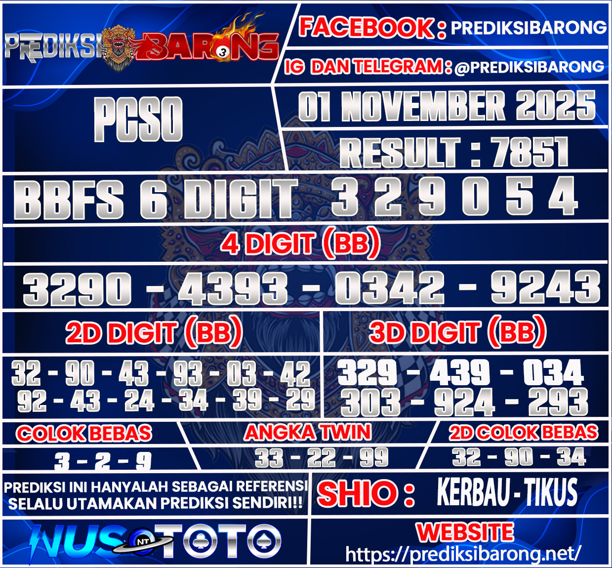 Selamat datang di Situs Prediksi Barong. Prediksi Barong merupakan situs prediksi angka togel yang berasal dari situs togel terpercaya dan teramanah yaitu NUSTOTO. Prediksi Barong sendiri sudah berdiri dari tahun 2018 hingga sekarang dan kualitasnya sudah di uji oleh para ahli paito dan pecinta togel resmi. Hari ini Prediksi Barong telah menyediakan Prediksi PCSO