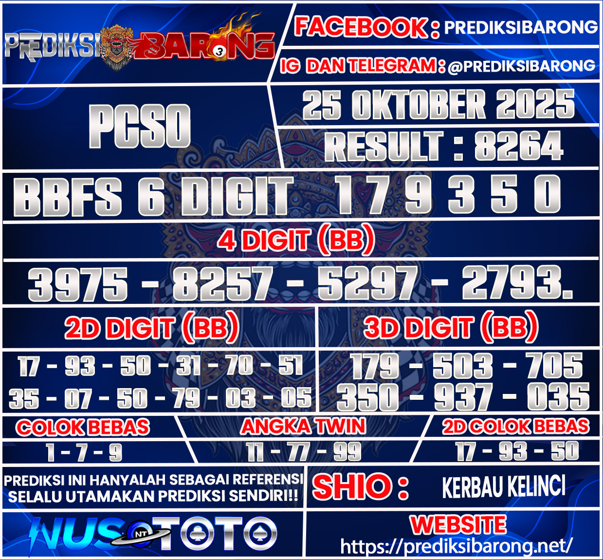 Prediksi Barong adalah layanan prediksi togel yang dirancang khusus untuk membantu para pemain togel dalam meraih keberuntungan. Pada edisi kali ini, kami menyajikan prediksi togel untuk pasar PCSO pada hari Sabtu 18 Oktober 2025. Dengan analisis mendalam dan metode yang telah teruji, kami berusaha memberikan angka-angka yang memiliki potensi tinggi untuk keluar. Prediksi ini tidak hanya berdasarkan keberuntungan semata, tetapi juga menggunakan data statistik dan pola permainan sebelumnya yang dapat memberikan wawasan lebih bagi para pemain.