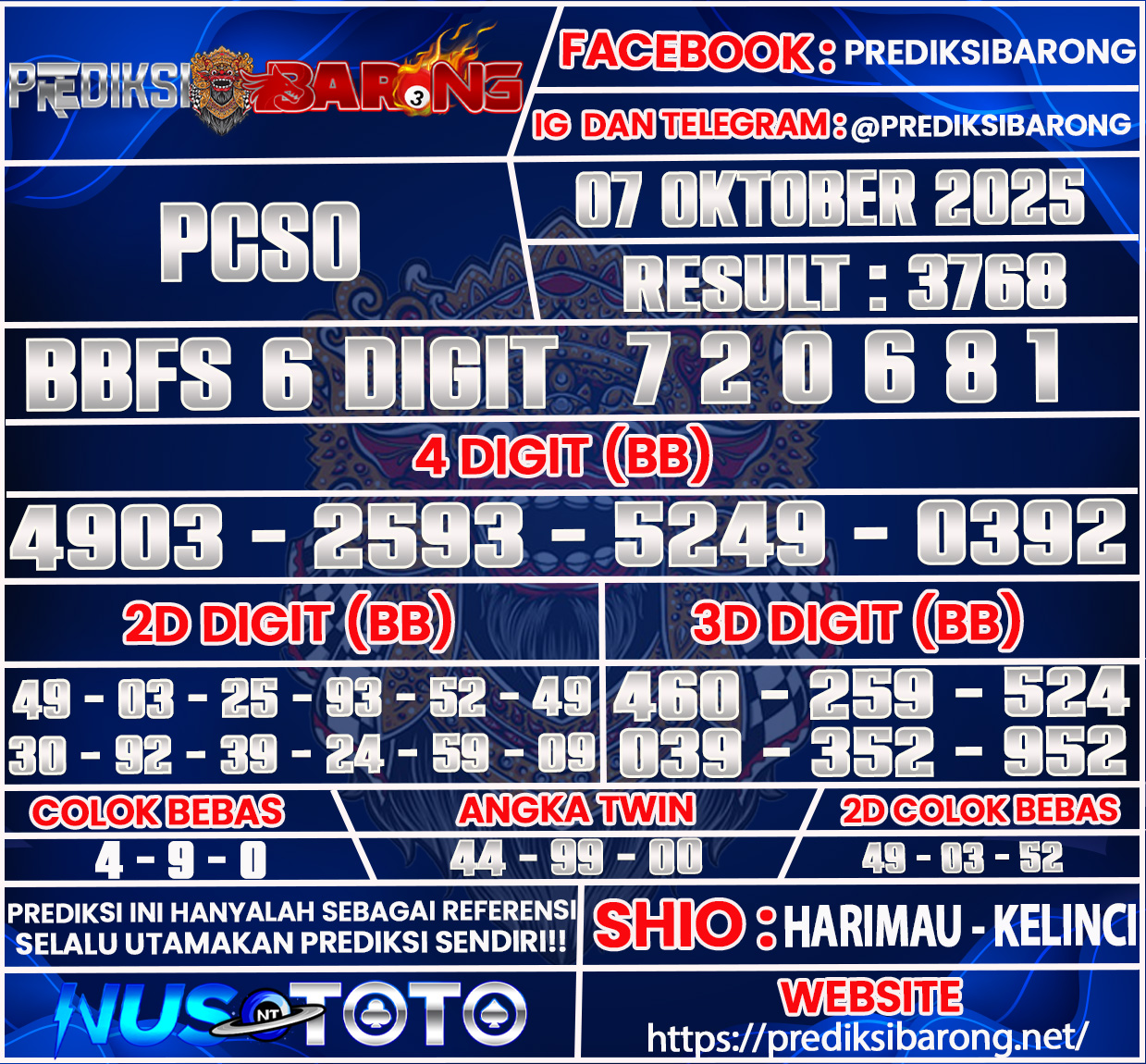 Prediksi Barong » Prediksi Togel PCSO Selasa 07 Oktober 2025
