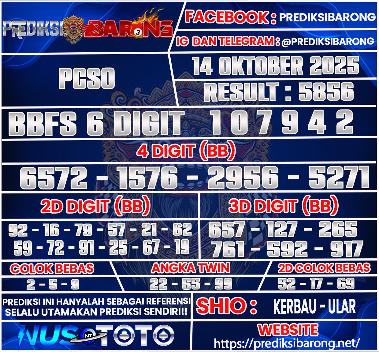Prediksi Barong adalah layanan prediksi togel yang dirancang khusus untuk membantu para pemain togel dalam meraih keberuntungan. Pada edisi kali ini, kami menyajikan prediksi togel untuk pasar PCSO pada hari Selasa 14Oktober 2025. Dengan analisis mendalam dan metode yang telah teruji, kami berusaha memberikan angka-angka yang memiliki potensi tinggi untuk keluar. Prediksi ini tidak hanya berdasarkan keberuntungan semata, tetapi juga menggunakan data statistik dan pola permainan sebelumnya yang dapat memberikan wawasan lebih bagi para pemain.