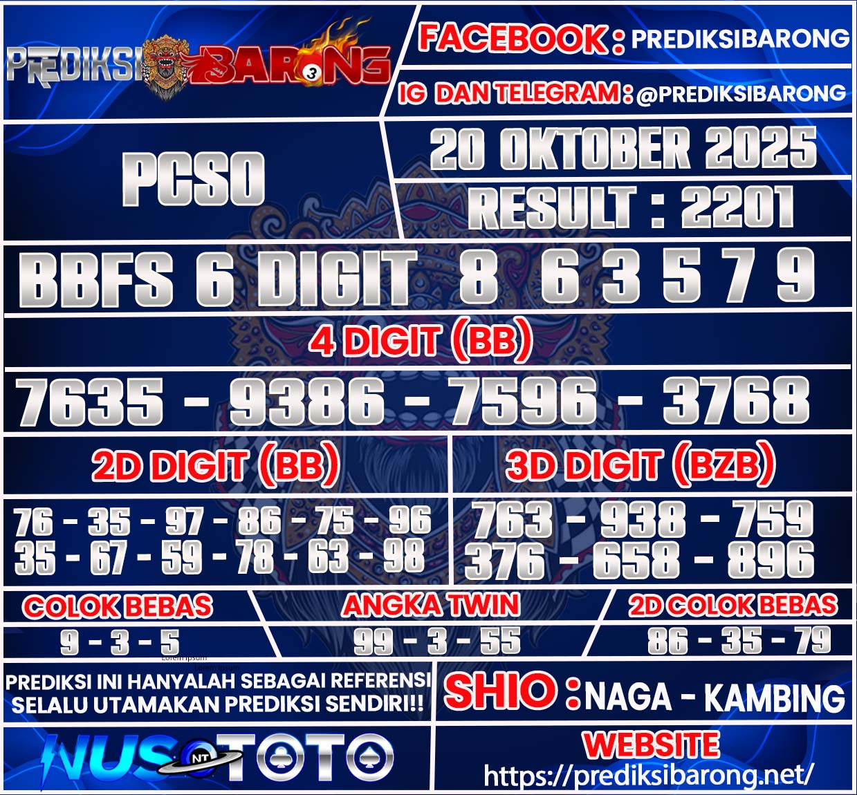 Oleh karena itu tanpa menunggu lama inilah Prediksi PCSO Senin tanggal 20 Oktober 2025 Dari Prediksi Barong :
