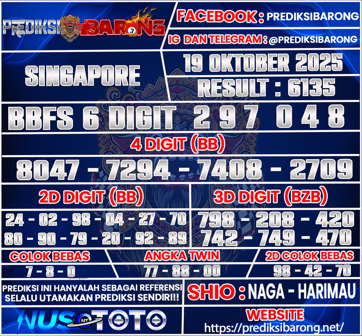 Prediksi Barong adalah layanan prediksi togel yang dirancang khusus untuk membantu para pemain togel dalam meraih keberuntungan. Pada edisi kali ini, kami menyajikan prediksi togel untuk pasar SINGAPORE pada hari Minggu 19 Oktober 2025. Dengan analisis mendalam dan metode yang telah teruji, kami berusaha memberikan angka-angka yang memiliki potensi tinggi untuk keluar. Prediksi ini tidak hanya berdasarkan keberuntungan semata, tetapi juga menggunakan data statistik dan pola permainan sebelumnya yang dapat memberikan wawasan lebih bagi para pemain.