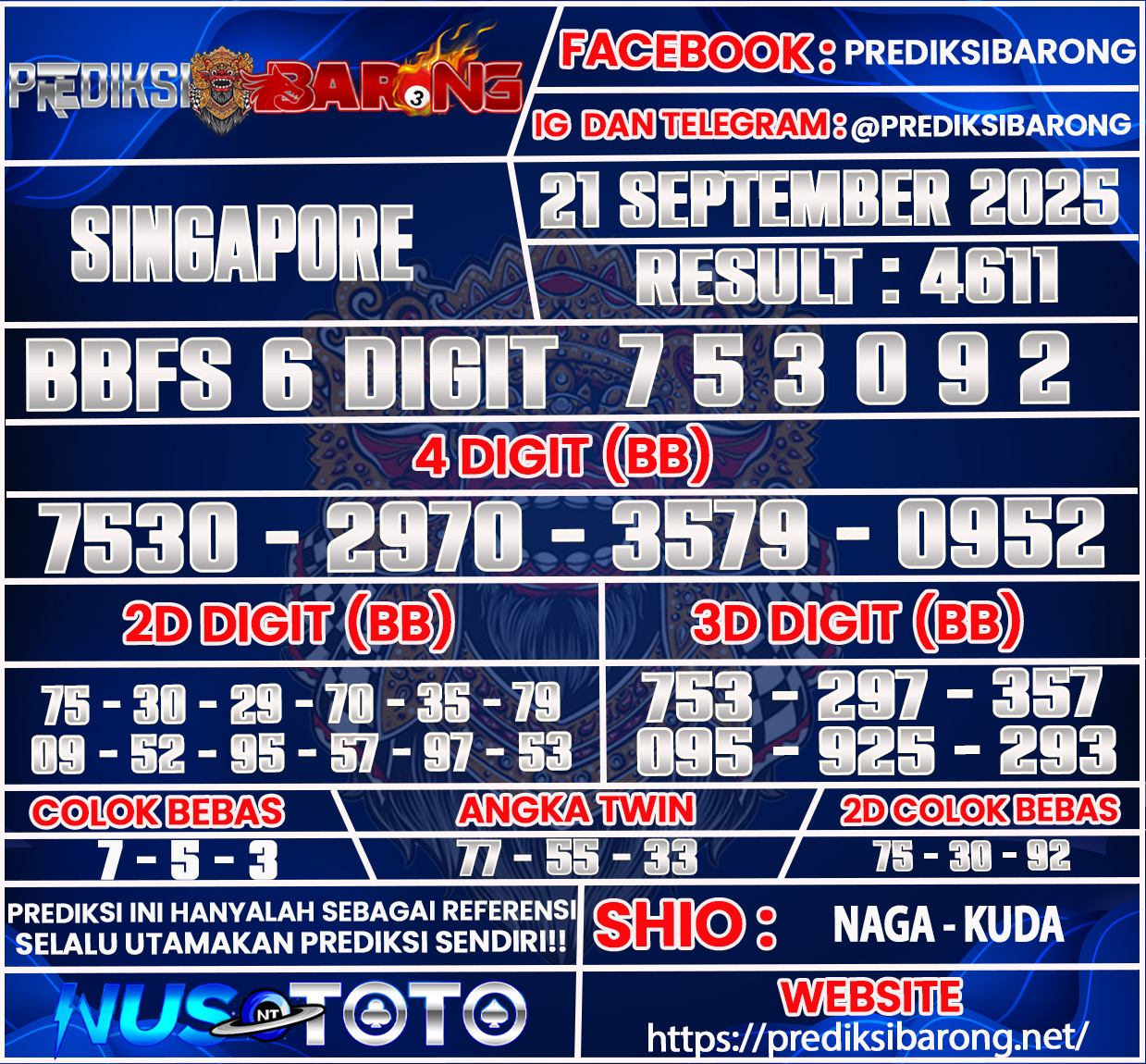 Delamat datang di Situs Prediksi Barong. Prediksi Barong merupakan situs prediksi angka togel yang berasal dari situs togel terpercaya dan teramanah yaitu NUSTOTO. Prediksi Barong sendiri sudah berdiri dari tahun 2018 hingga sekarang dan kualitasnya sudah di uji oleh para ahli paito dan pecinta togel resmi. Hari ini Prediksi Barong telah menyediakan Prediksi SINGAPORE Minggu 21September 2025 untuk anda semuanya.