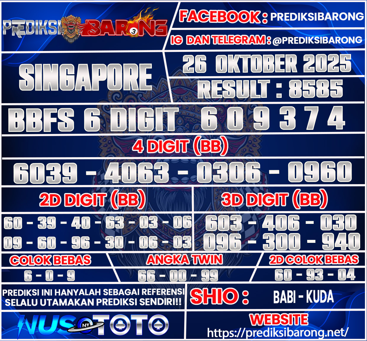 Selamat datang di Situs Prediksi Barong. Prediksi Barong merupakan situs prediksi angka togel yang berasal dari situs togel terpercaya dan teramanah yaitu NUSTOTO. Prediksi Barong sendiri sudah berdiri dari tahun 2018 hingga sekarang dan kualitasnya sudah di uji oleh para ahli paito dan pecinta togel resmi. Hari ini Prediksi Barong telah menyediakan Prediksi SINGAPORE Sabtu 25 Oktober 2025 untuk anda semuanya.