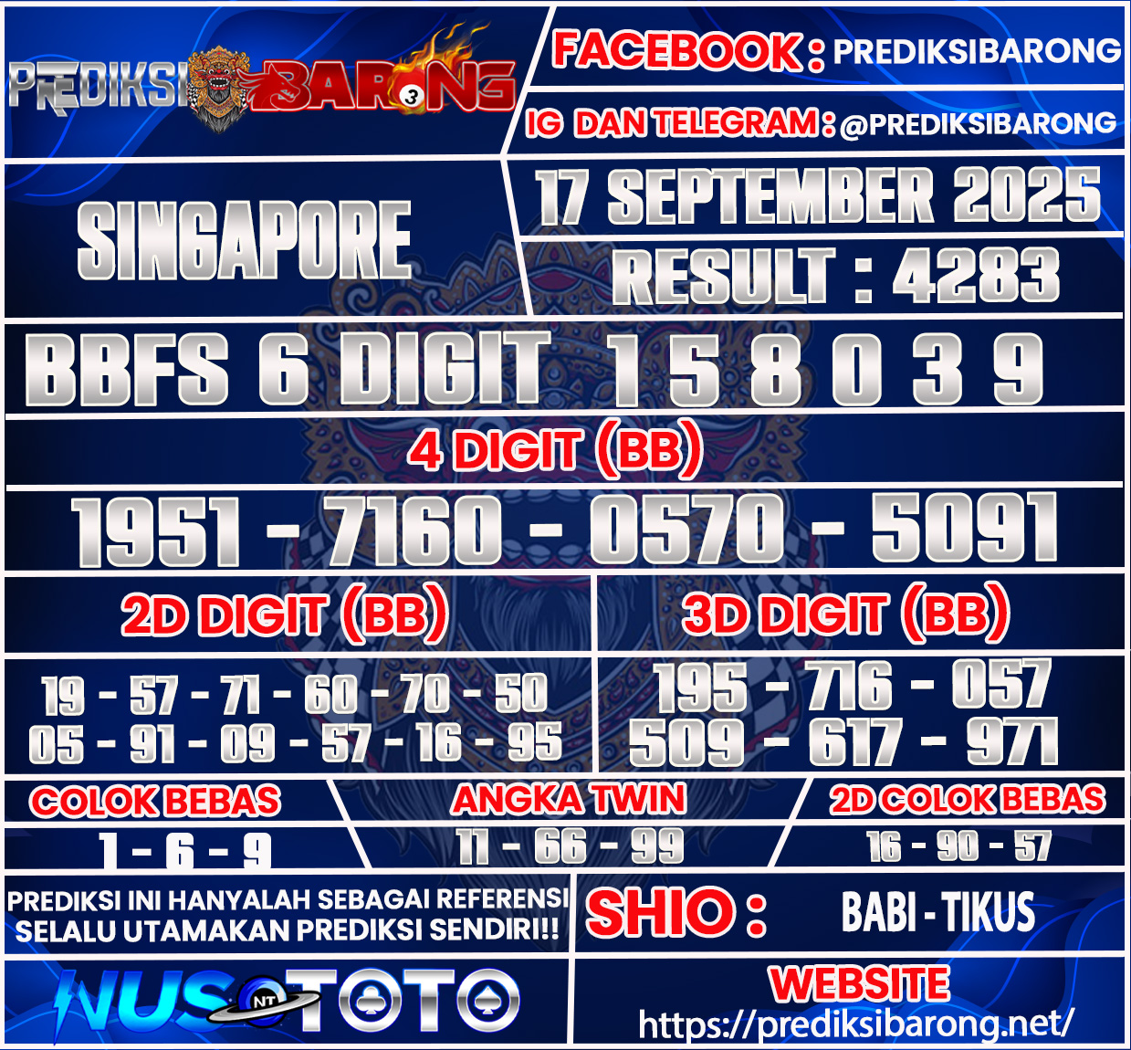 Delamat datang di Situs Prediksi Barong. Prediksi Barong merupakan situs prediksi angka togel yang berasal dari situs togel terpercaya dan teramanah yaitu NUSTOTO. Prediksi Barong sendiri sudah berdiri dari tahun 2018 hingga sekarang dan kualitasnya sudah di uji oleh para ahli paito dan pecinta togel resmi. Hari ini Prediksi Barong telah menyediakan Prediksi SINGAPORE Rabu 17 September 2025 untuk anda semuanya.
