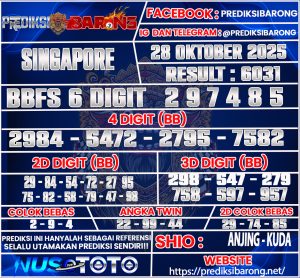 Prediksi Barong adalah layanan prediksi togel yang dirancang khusus untuk membantu para pemain togel dalam meraih keberuntungan. Pada edisi kali ini, kami menyajikan prediksi togel untuk pasar SINGAPORE pada hari Minggu 19 Oktober 2025. Dengan analisis mendalam dan metode yang telah teruji, kami berusaha memberikan angka-angka yang memiliki potensi tinggi untuk keluar. Prediksi ini tidak hanya berdasarkan keberuntungan semata, tetapi juga menggunakan data statistik dan pola permainan sebelumnya yang dapat memberikan wawasan lebih bagi para pemain.