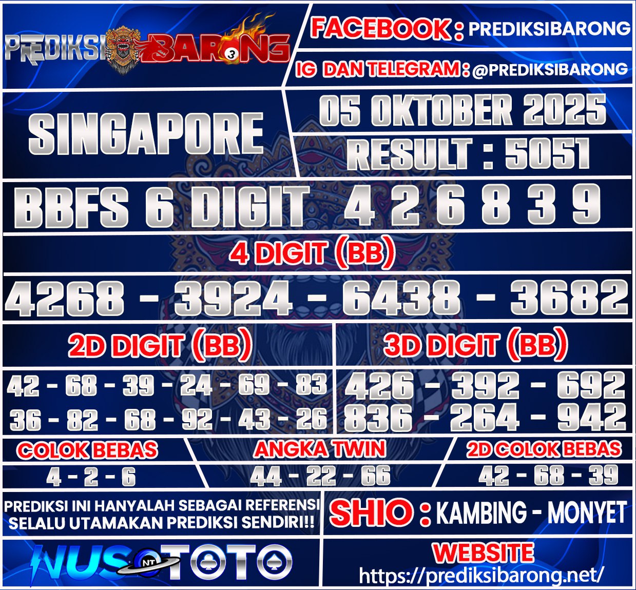 Prediksi Barong adalah layanan prediksi togel yang dirancang khusus untuk membantu para pemain togel dalam meraih keberuntungan. Pada edisi kali ini, kami menyajikan prediksi togel untuk pasar SINGAPORE pada hari Minggu 05Oktober 2025. Dengan analisis mendalam dan metode yang telah teruji, kami berusaha memberikan angka-angka yang memiliki potensi tinggi untuk keluar. Prediksi ini tidak hanya berdasarkan keberuntungan semata, tetapi juga menggunakan data statistik dan pola permainan sebelumnya yang dapat memberikan wawasan lebih bagi para pemain.