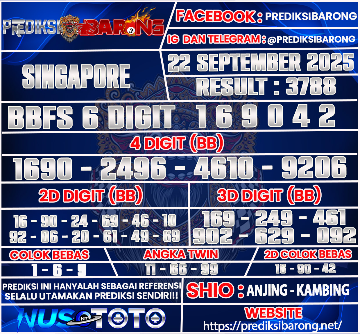 Selamat datang di Situs Prediksi Barong. Prediksi Barong merupakan situs prediksi angka togel yang berasal dari situs togel terpercaya dan teramanah yaitu NUSTOTO. Prediksi Barong sendiri sudah berdiri dari tahun 2018 hingga sekarang dan kualitasnya sudah di uji oleh para ahli paito dan pecinta togel resmi. Hari ini Prediksi Barong telah menyediakan Prediksi SINGAPORE Senin 22 September 2025 untuk anda semuanya.
