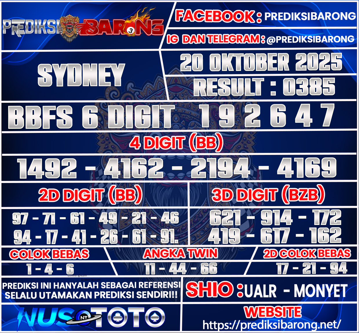 selamat datang di Situs Prediksi Barong. Prediksi Barong merupakan situs prediksi angka togel yang berasal dari situs togel terpercaya dan teramanah yaitu NUSTOTO. Prediksi Barong sendiri sudah berdiri dari tahun 2019 hingga sekarang dan kualitasnya sudah di uji oleh para ahli paito dan pecinta togel resmi. Hari ini Prediksi Barong telah menyediakan Prediksi Sydney Minggu 19 Oktober 2025 untuk anda semuanya.