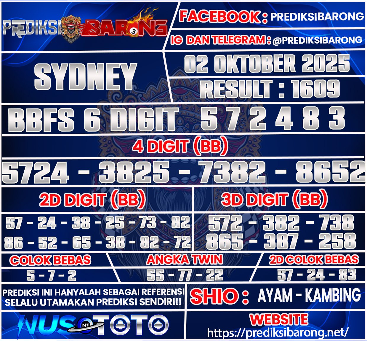 Prediksi Barong adalah layanan prediksi togel yang dirancang khusus untuk membantu para pemain togel dalam meraih keberuntungan. Pada edisi kali ini, kami menyajikan prediksi togel untuk pasar Sydney pada hari Kamis 02 Oktober 2025. Dengan analisis mendalam dan metode yang telah teruji, kami berusaha memberikan angka-angka yang memiliki potensi tinggi untuk keluar. Prediksi ini tidak hanya berdasarkan keberuntungan semata, tetapi juga menggunakan data statistik dan pola permainan sebelumnya yang dapat memberikan wawasan lebih bagi para pemain.