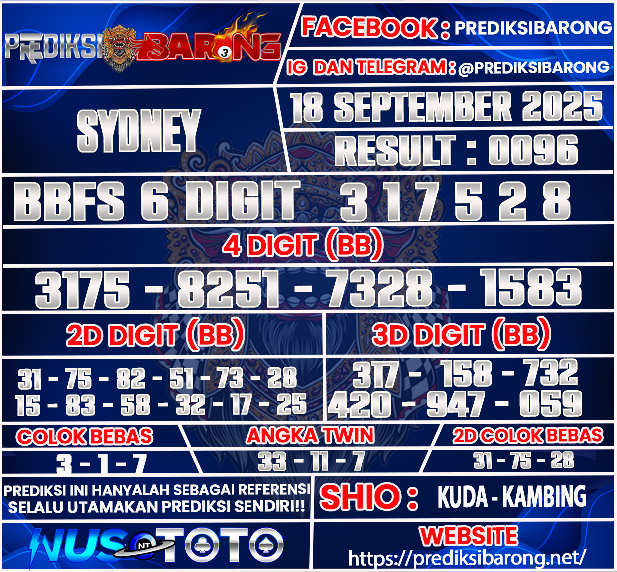 Selamat datang di Situs Prediksi Barong. Prediksi Barong merupakan situs prediksi angka togel yang berasal dari situs togel terpercaya dan teramanah yaitu NUSTOTO. Prediksi Barong sendiri sudah berdiri dari tahun 2018 hingga sekarang dan kualitasnya sudah di uji oleh para ahli paito dan pecinta togel resmi. Hari ini Prediksi Barong telah menyediakan Prediksi Sydney Kamis 18 September 2025 untuk anda semuanya.