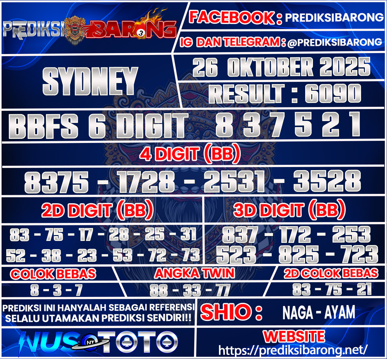 selamat datang di Situs Prediksi Barong. Prediksi Barong merupakan situs prediksi angka togel yang berasal dari situs togel terpercaya dan teramanah yaitu NUSTOTO. Prediksi Barong sendiri sudah berdiri dari tahun 2019 hingga sekarang dan kualitasnya sudah di uji oleh para ahli paito dan pecinta togel resmi. Hari ini Prediksi Barong telah menyediakan Prediksi Sydney Sabtu 25 Oktober 2025 untuk anda semuanya.