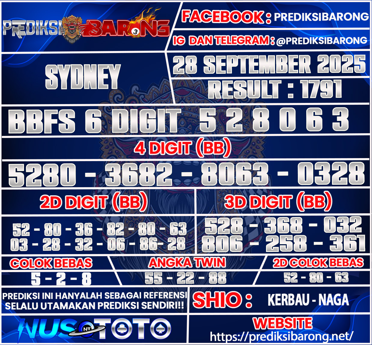Selamat datang di Situs Prediksi Barong. Prediksi Barong merupakan situs prediksi angka togel yang berasal dari situs togel terpercaya dan teramanah yaitu NUSTOTO. Prediksi Barong sendiri sudah berdiri dari tahun 2019 hingga sekarang dan kualitasnya sudah di uji oleh para ahli paito dan pecinta togel resmi. Hari ini Prediksi Barong telah menyediakan Prediksi Sydney Minggu 28 September 2025 untuk anda semuanya.