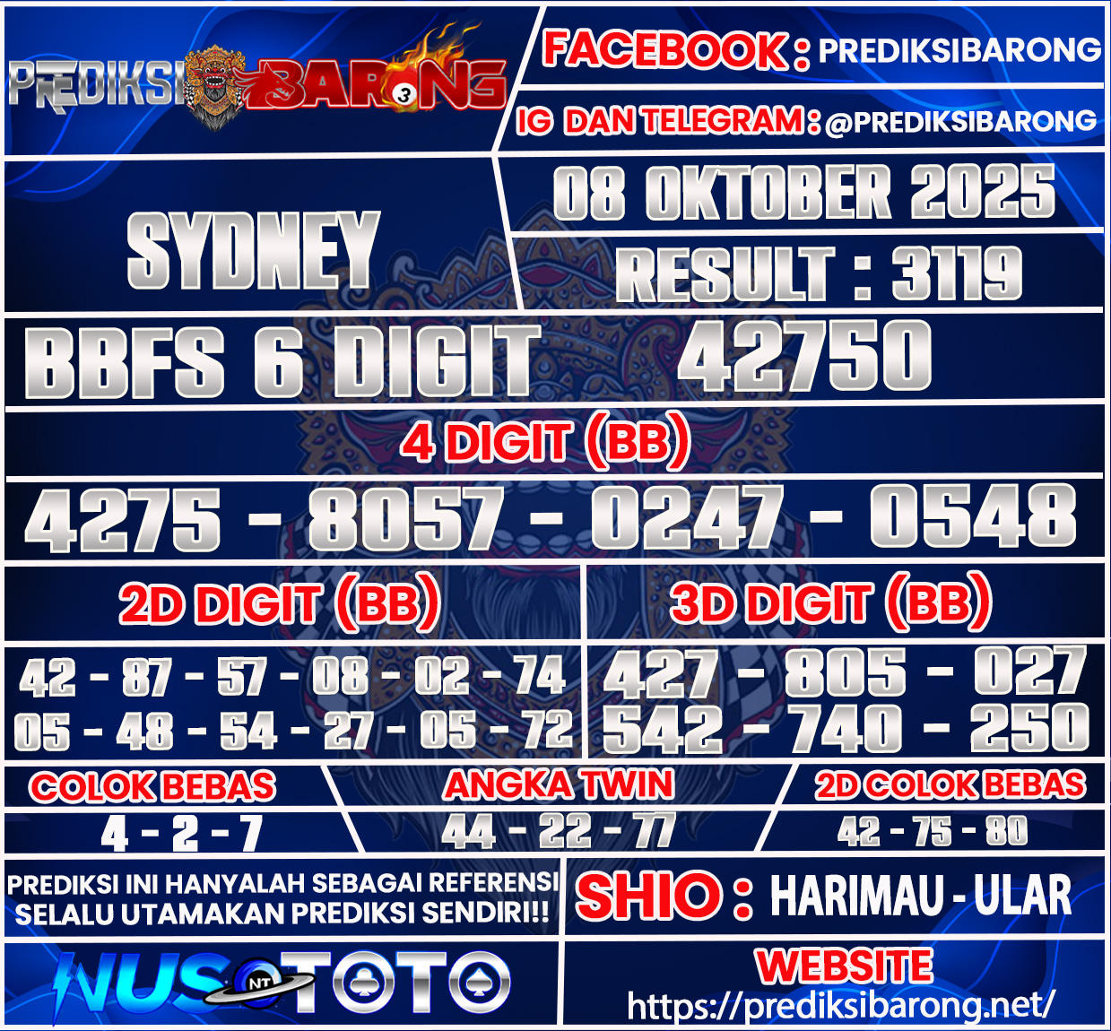 Selamat datang di Situs Prediksi Barong. Prediksi Barong merupakan situs prediksi angka togel yang berasal dari situs togel terpercaya dan teramanah yaitu NUSTOTO. Prediksi Barong sendiri sudah berdiri dari tahun 2019 hingga sekarang dan kualitasnya sudah di uji oleh para ahli paito dan pecinta togel resmi. Hari ini Prediksi Barong telah menyediakan Prediksi Sydney Rabu 08 Oktober 2025 untuk anda semuanya.