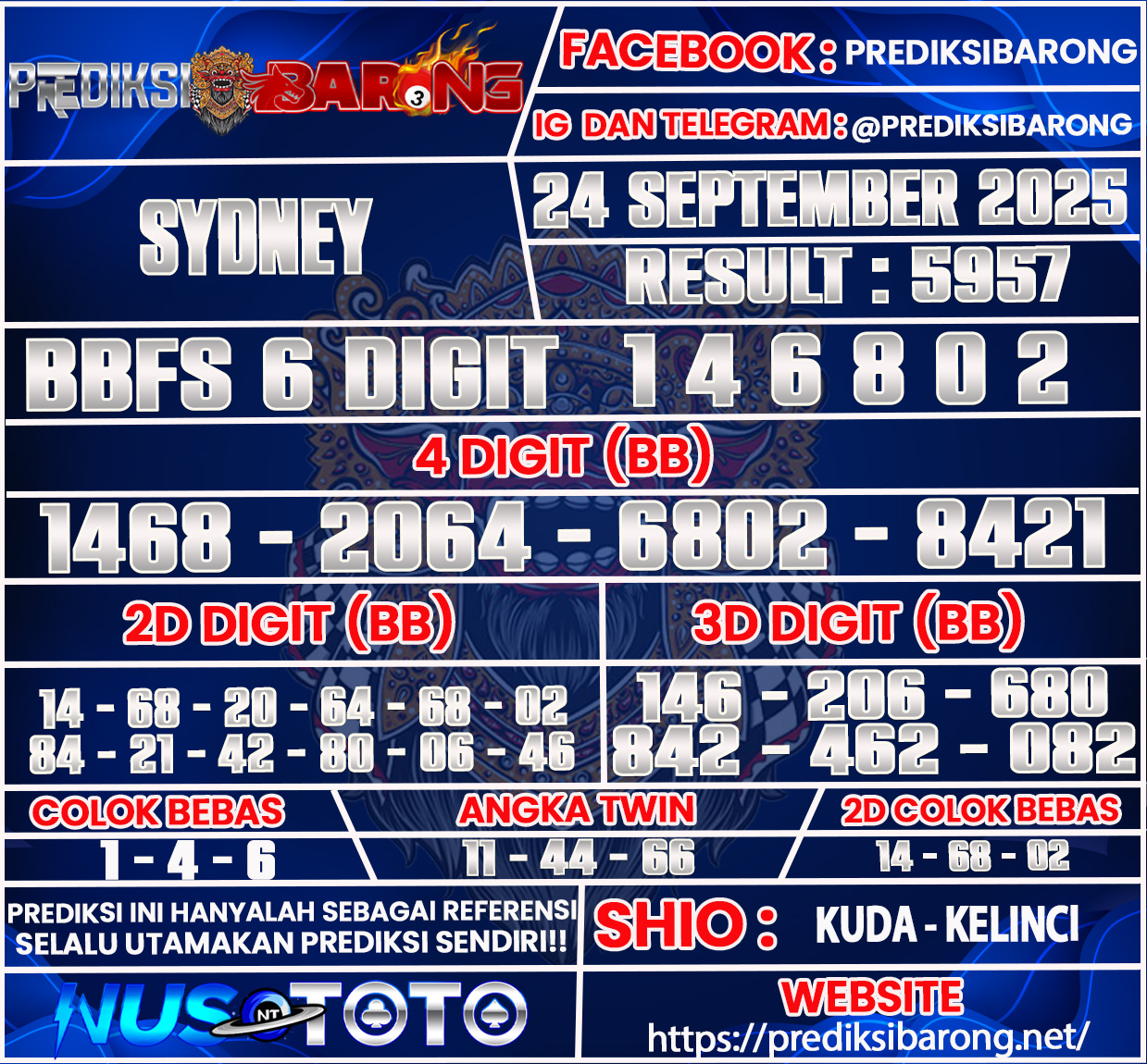 Selamat datang di Situs Prediksi Barong. Prediksi Barong merupakan situs prediksi angka togel yang berasal dari situs togel terpercaya dan teramanah yaitu NUSTOTO. Prediksi Barong sendiri sudah berdiri dari tahun 2019 hingga sekarang dan kualitasnya sudah di uji oleh para ahli paito dan pecinta togel resmi. Hari ini Prediksi Barong telah menyediakan Prediksi Sydney Rabu 24 September 2025 untuk anda semuanya.