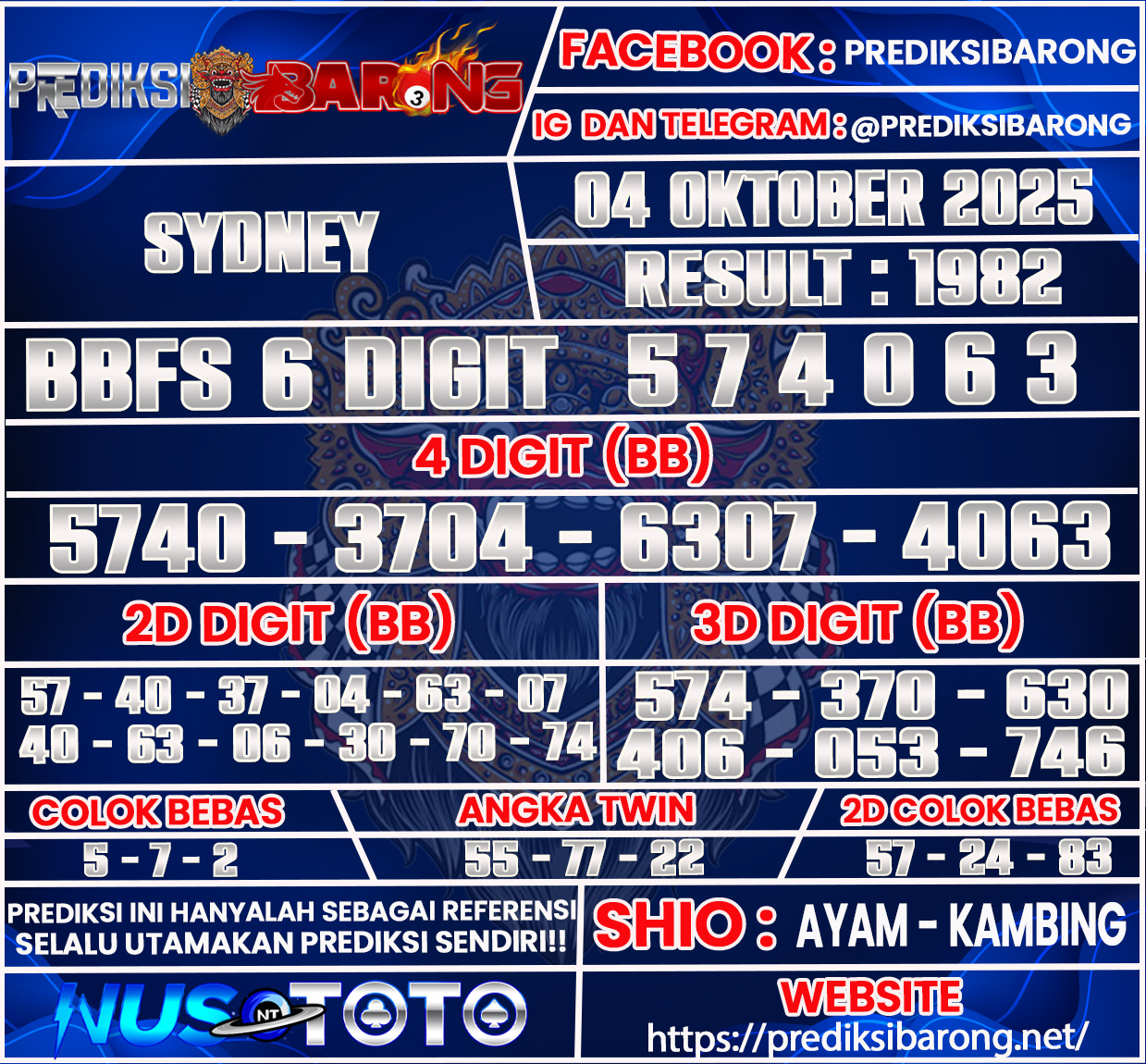 Selamat datang di Situs Prediksi Barong. Prediksi Barong merupakan situs prediksi angka togel yang berasal dari situs togel terpercaya dan teramanah yaitu NUSTOTO. Prediksi Barong sendiri sudah berdiri dari tahun 2019 hingga sekarang dan kualitasnya sudah di uji oleh para ahli paito dan pecinta togel resmi. Hari ini Prediksi Barong telah menyediakan Prediksi Sydney Jumat 03 Oktober 2025 untuk anda semuanya.