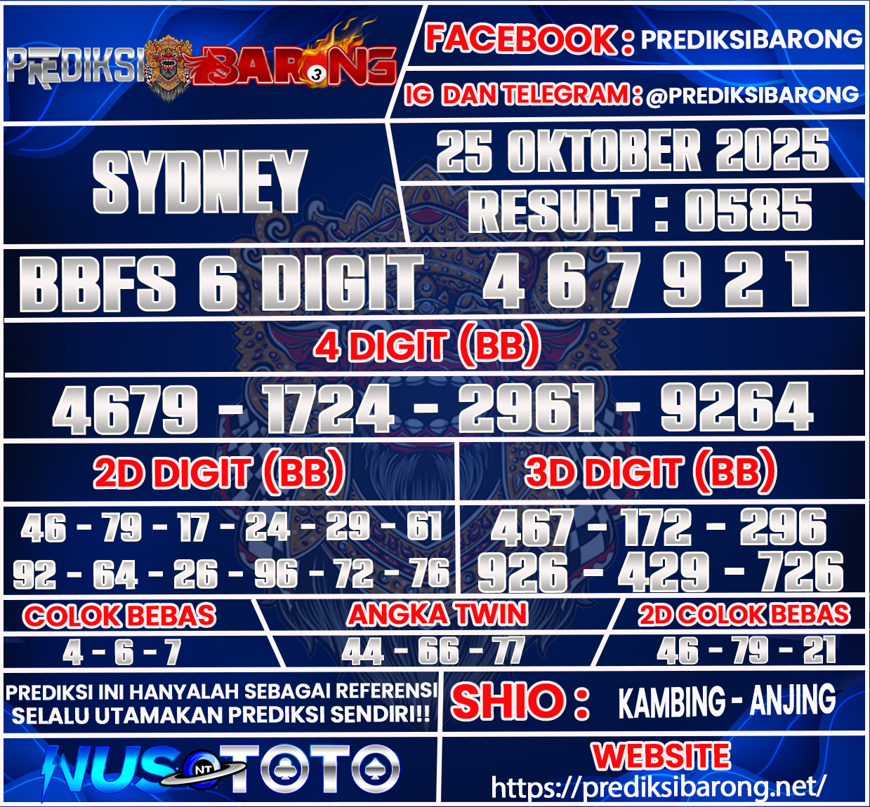 Prediksi Barong adalah layanan prediksi togel yang dirancang khusus untuk membantu para pemain togel dalam meraih keberuntungan. Pada edisi kali ini, kami menyajikan prediksi togel untuk pasar Sydney pada hari Sabtu 25 Oktober 2025. Dengan analisis mendalam dan metode yang telah teruji, kami berusaha memberikan angka-angka yang memiliki potensi tinggi untuk keluar. Prediksi ini tidak hanya berdasarkan keberuntungan semata, tetapi juga menggunakan data statistik dan pola permainan sebelumnya yang dapat memberikan wawasan lebih bagi para pemain.