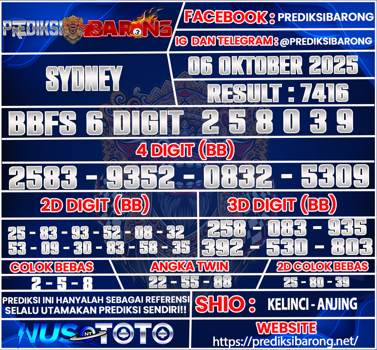 Selamat datang di Situs Prediksi Barong. Prediksi Barong merupakan situs prediksi angka togel yang berasal dari situs togel terpercaya dan teramanah yaitu NUSTOTO. Prediksi Barong sendiri sudah berdiri dari tahun 2019 hingga sekarang dan kualitasnya sudah di uji oleh para ahli paito dan pecinta togel resmi. Hari ini Prediksi Barong telah menyediakan Prediksi Sydney Senin 06 Oktober 2025 untuk anda semuanya.