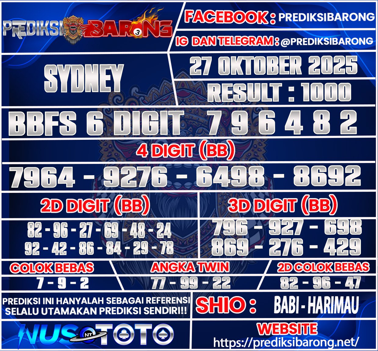 Prediksi Barong adalah layanan prediksi togel yang dirancang khusus untuk membantu para pemain togel dalam meraih keberuntungan. Pada edisi kali ini, kami menyajikan prediksi togel untuk pasar Sydney pada hari Sabtu 25 Oktober 2025. Dengan analisis mendalam dan metode yang telah teruji, kami berusaha memberikan angka-angka yang memiliki potensi tinggi untuk keluar. Prediksi ini tidak hanya berdasarkan keberuntungan semata, tetapi juga menggunakan data statistik dan pola permainan sebelumnya yang dapat memberikan wawasan lebih bagi para pemain.