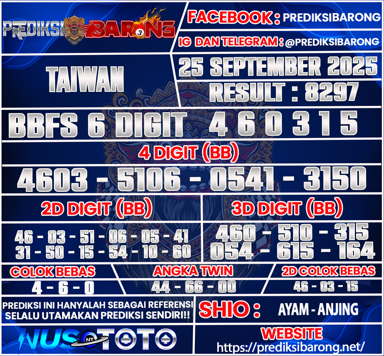 Selamat datang di Situs Prediksi Barong. Prediksi Barong merupakan situs prediksi angka togel yang berasal dari situs togel terpercaya dan teramanah yaitu NUSTOTO. Prediksi Barong sendiri sudah berdiri dari tahun 2018 hingga sekarang dan kualitasnya sudah di uji oleh para ahli paito dan pecinta togel resmi. Hari ini Prediksi Barong telah menyediakan Prediksi TAIWAN Kamis 25 September 2025 untuk anda semuanya.