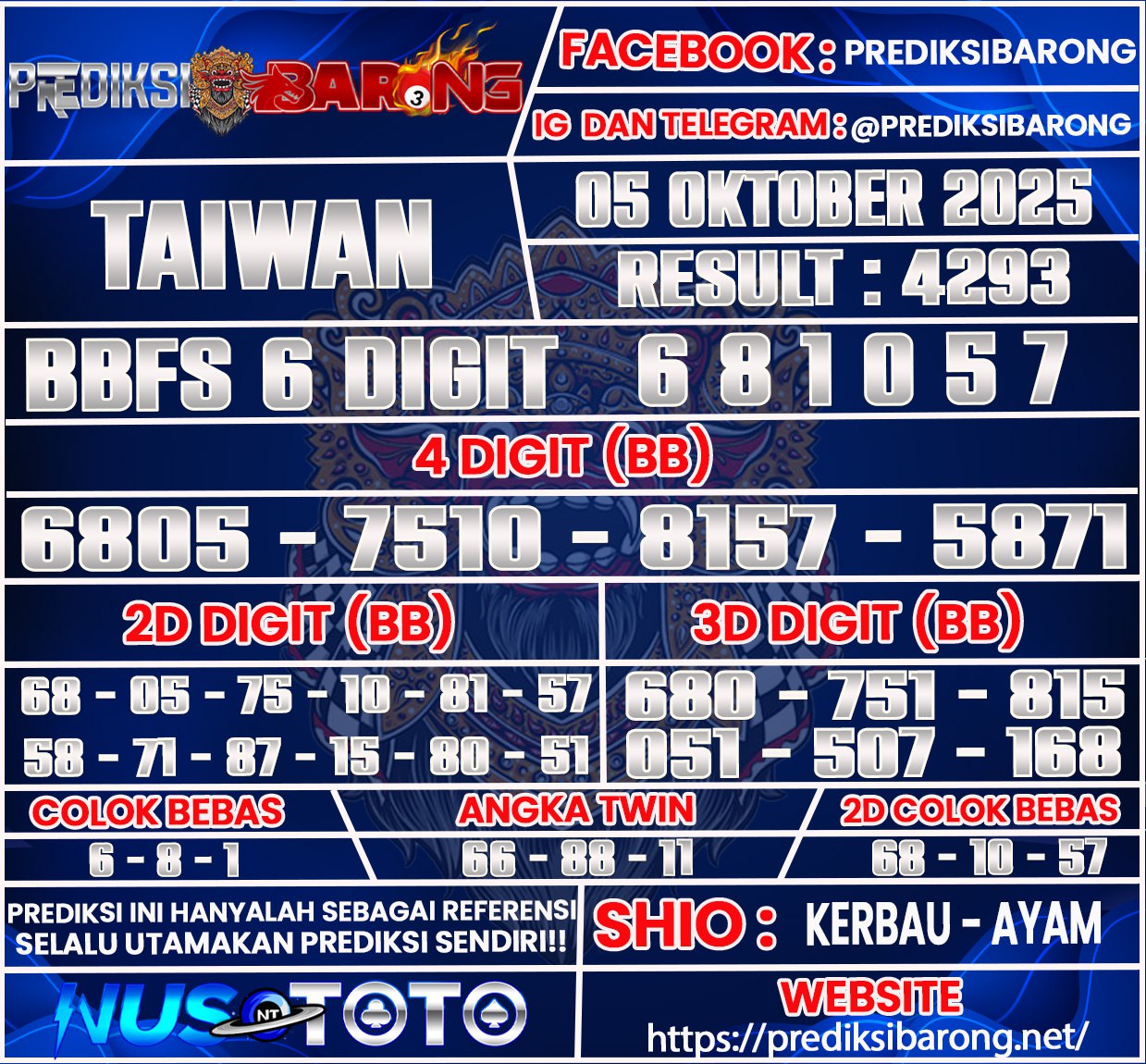 Selamat datang di Situs Prediksi Barong. Prediksi Barong merupakan situs prediksi angka togel yang berasal dari situs togel terpercaya dan teramanah yaitu NUSTOTO. Prediksi Barong sendiri sudah berdiri dari tahun 2018 hingga sekarang dan kualitasnya sudah di uji oleh para ahli paito dan pecinta togel resmi. Hari ini Prediksi Barong telah menyediakan Prediksi TAIWAN Minggu 05 Oktober 2025 untuk anda semuanya.