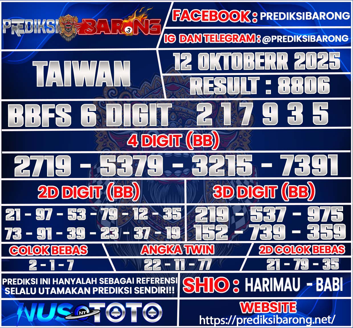 Prediksi Barong adalah layanan prediksi togel yang dirancang khusus untuk membantu para pemain togel dalam meraih keberuntungan. Pada edisi kali ini, kami menyajikan prediksi togel untuk pasar TAIWAN pada  Minggu 12 Oktober 2025. Dengan analisis mendalam dan metode yang telah teruji, kami berusaha memberikan angka-angka yang memiliki potensi tinggi untuk keluar. Prediksi ini tidak hanya berdasarkan keberuntungan semata, tetapi juga menggunakan data statistik dan pola permainan sebelumnya yang dapat memberikan wawasan lebih bagi para pemain.