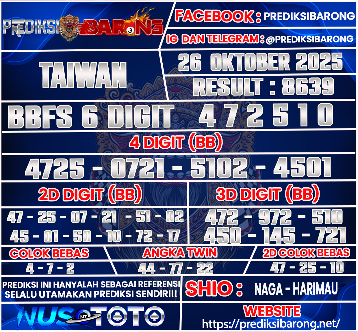 Selamat datang di Situs Prediksi Barong. Prediksi Barong merupakan situs prediksi angka togel yang berasal dari situs togel terpercaya dan teramanah yaitu NUSTOTO. Prediksi Barong sendiri sudah berdiri dari tahun 2018 hingga sekarang dan kualitasnya sudah di uji oleh para ahli paito dan pecinta togel resmi. Hari ini Prediksi Barong telah menyediakan Prediksi TAIWAN MRabu 22 Oktober 2025 untuk anda semuanya.