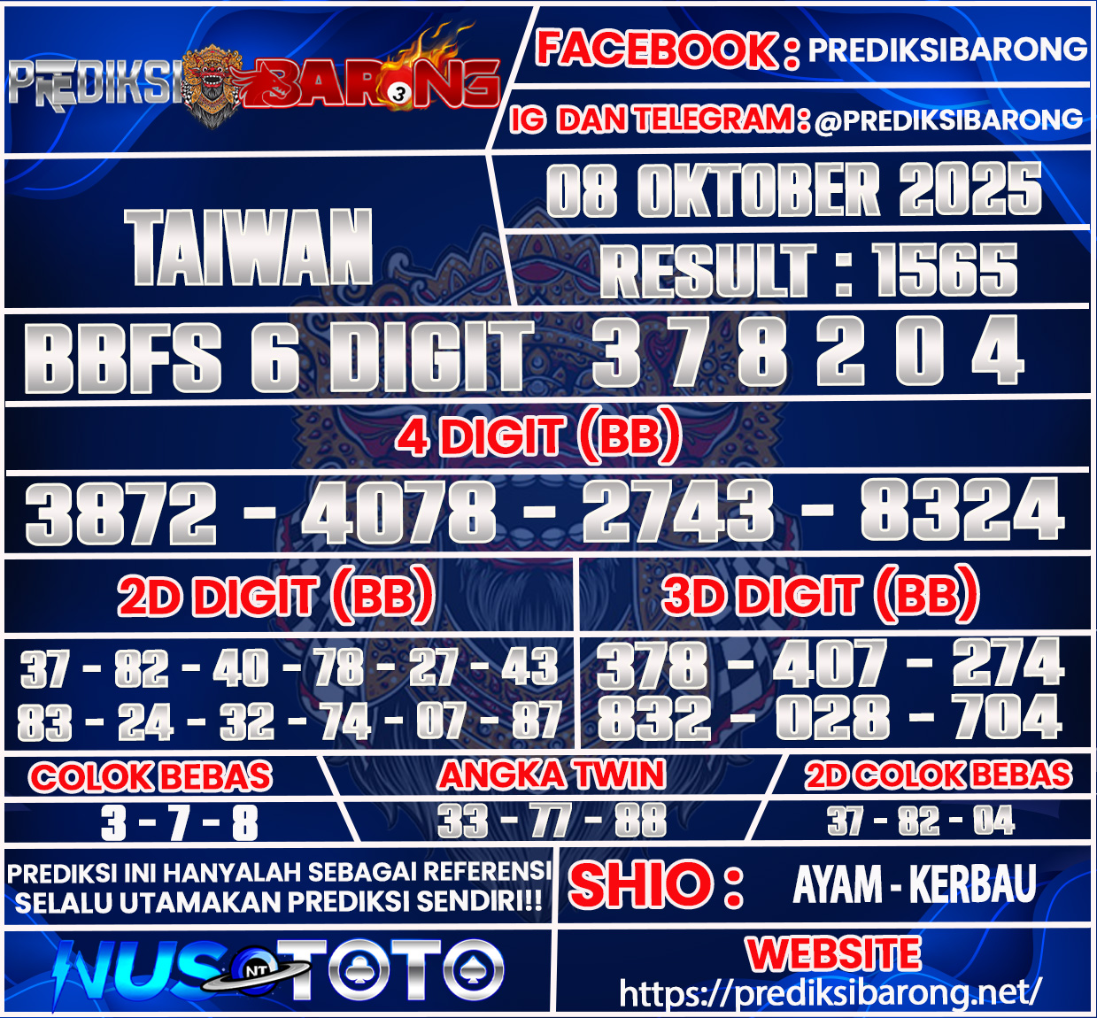 Prediksi Barong adalah layanan prediksi togel yang dirancang khusus untuk membantu para pemain togel dalam meraih keberuntungan. Pada edisi kali ini, kami menyajikan prediksi togel untuk pasar TAIWAN pada Rabu 08 Oktober 2025. Dengan analisis mendalam dan metode yang telah teruji, kami berusaha memberikan angka-angka yang memiliki potensi tinggi untuk keluar. Prediksi ini tidak hanya berdasarkan keberuntungan semata, tetapi juga menggunakan data statistik dan pola permainan sebelumnya yang dapat memberikan wawasan lebih bagi para pemain.