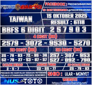 Prediksi Barong adalah layanan prediksi togel yang dirancang khusus untuk membantu para pemain togel dalam meraih keberuntungan. Pada edisi kali ini, kami menyajikan prediksi togel untuk pasar TAIWAN pada  Rabu 15 Oktober 2025. Dengan analisis mendalam dan metode yang telah teruji, kami berusaha memberikan angka-angka yang memiliki potensi tinggi untuk keluar. Prediksi ini tidak hanya berdasarkan keberuntungan semata, tetapi juga menggunakan data statistik dan pola permainan sebelumnya yang dapat memberikan wawasan lebih bagi para pemain.